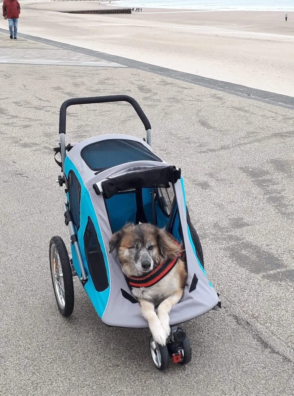 Everyday the volunteers would pad his wounds and one of the ladies donated her water shoes to him because they had a tough rubber sole, which meant he could drag his feet with hurting them anymore. Slowly his wounds got better, and someone donated a pair of proper dog shoes so he could go for walks. He used a wheelchair, but he got around very well without it.